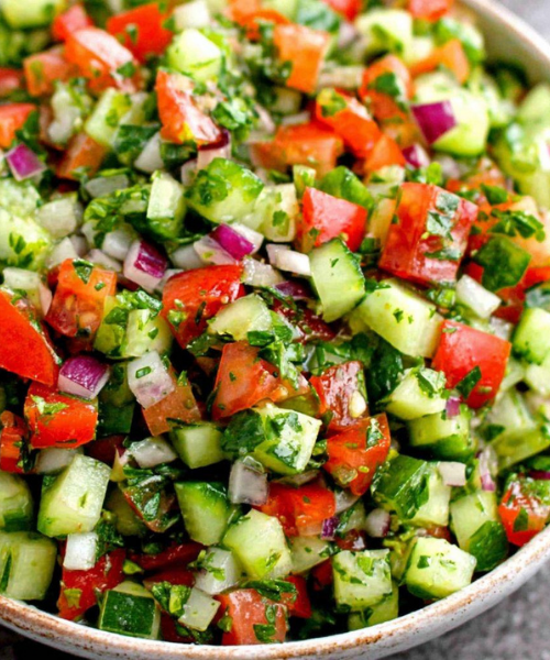 Lettuce, cucumber, tomato, onion & carrot with dressing.